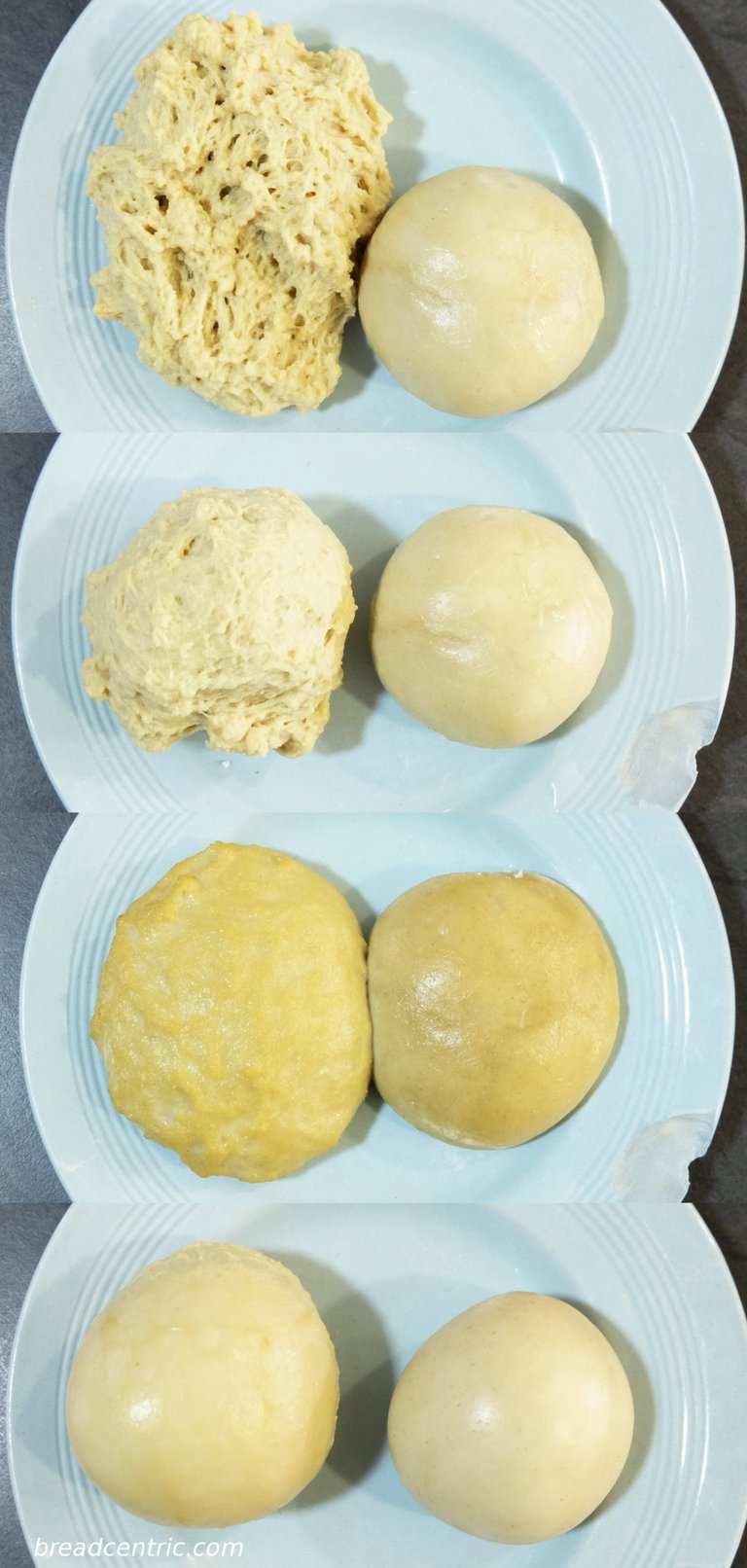 Gluten from powder (left) vs gluten from the dough (right): after the initial mixing, after some kneading, after resting for three hours, and finally after final stretch